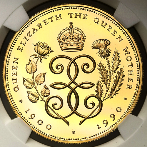皇太后生誕90年記念(通称名:バラとアザミ)5ポンド金貨 1990年 NGC PF70UltraCameo
