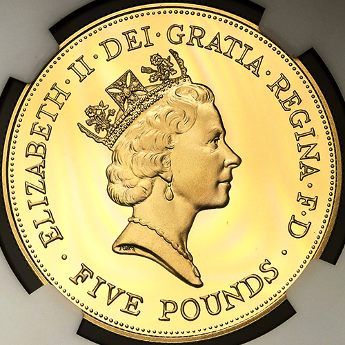 皇太后生誕90年記念(通称名:バラとアザミ)5ポンド金貨 1990年 NGC PF70UltraCameo